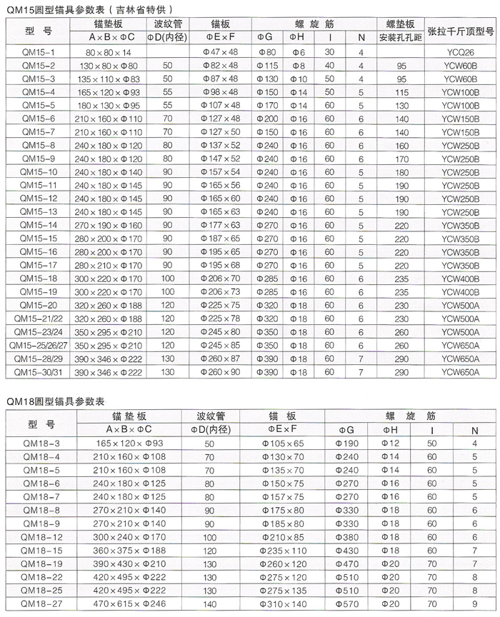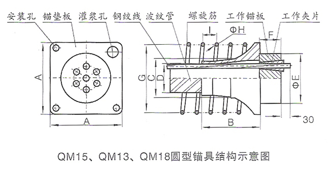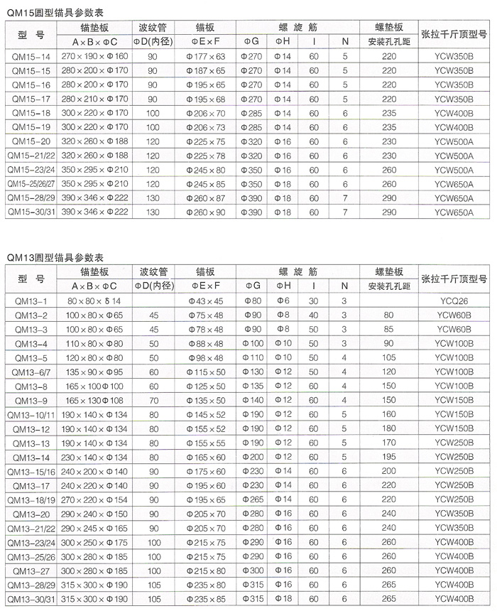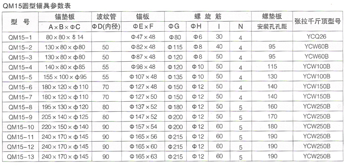 QMV張拉端錨具由夾片、錨環(huán)、錨墊板以及螺旋筋四部分組成,夾片是錨固體系的關(guān)鍵部件,其形式為二片式,用合金鋼制造。QMV13系列錨具用于錨固Ф12.7、Ф12.9鋼絞線;QMV15系列錨具用于錨固Ф15.2、Ф15.7鋼絞線;QMV18系列錨具用于錨固Ф17.8鋼絞線;QMV22、QMV28錨具分別用于外徑Ф21.8和Ф28.6鋼絞線的單根錨固和張拉。
